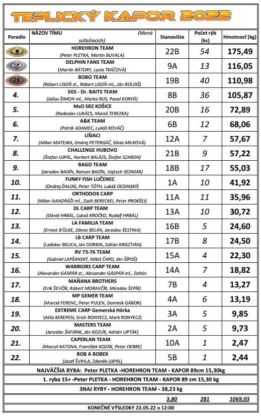 Prvé miesto bez prekvapenia obsadil Horehron Carp Team s obrovským náskokom, keď ulovili spolu 175,49 kg bodovaných rýb. Samozrejme, veľkým šťastím bol žreb, lebo miesto kde chalani sedeli, býva počas pretekov Teplický kapor takmer vždy úspešné (ak vietor nefúka smerom k hrádzi). Treba však oceniť neúnavnú prácu, ktorú odvádzali pri zdolávaní a kŕmení. Víťazný tím si odniesol aj ocenenia za najväčšiu rybu, za prvú rybu nad 15 kg, ako aj za 3 najväčšie ryby. Klobúk dole!
